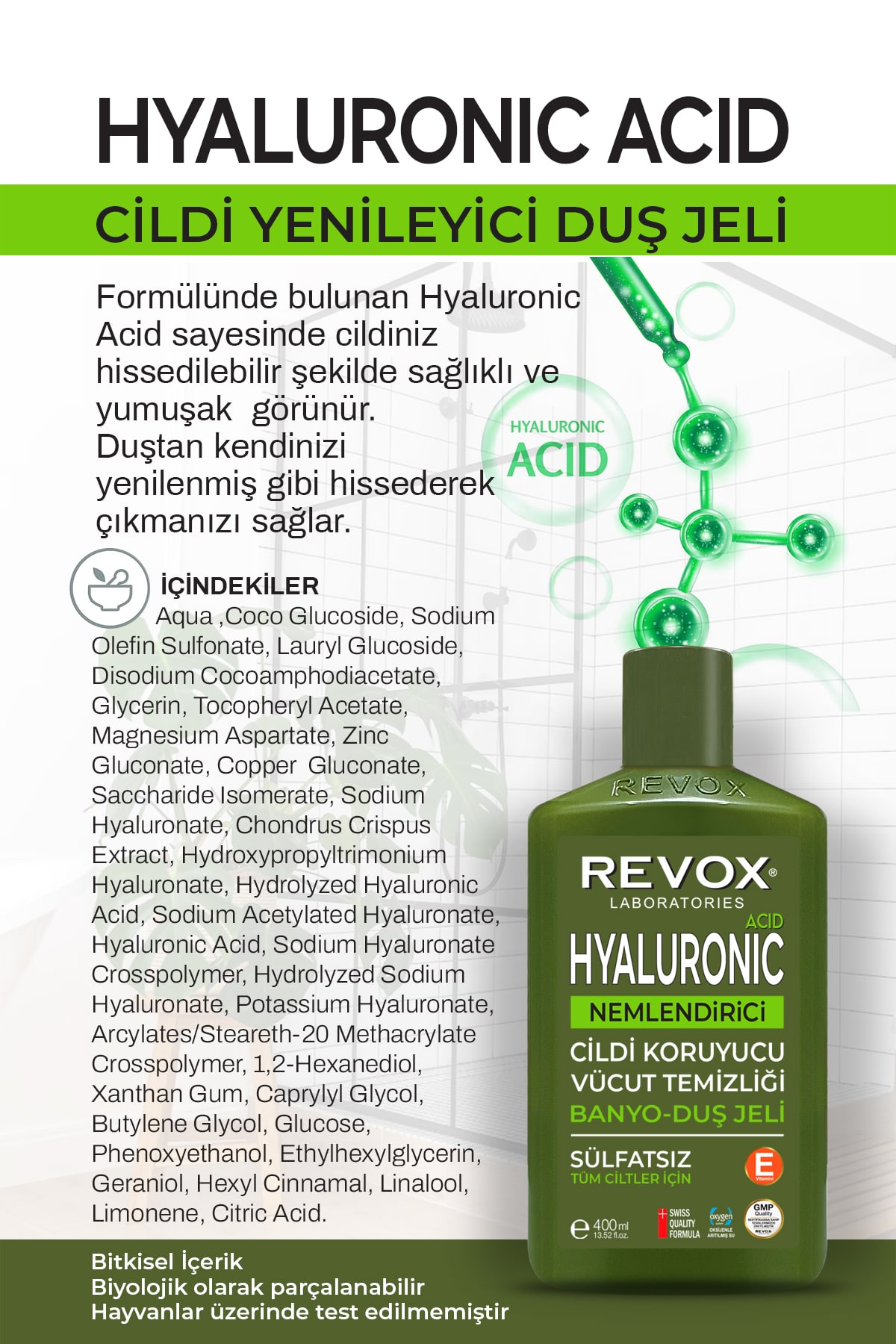 Hyaluronik asit, cildiniz için eşsiz bir nemlendirici seçenektir. Ciltte su tutma kapasitesi sayesinde, cilt tipiniz ne olursa olsun Hyaluronik Asit içeren bir REVOX LABORATORIES tarafından geliştirilen nemlendirici duş jeline bakım rutininizde gönül rahatlığıyla yer verebilirsiniz.