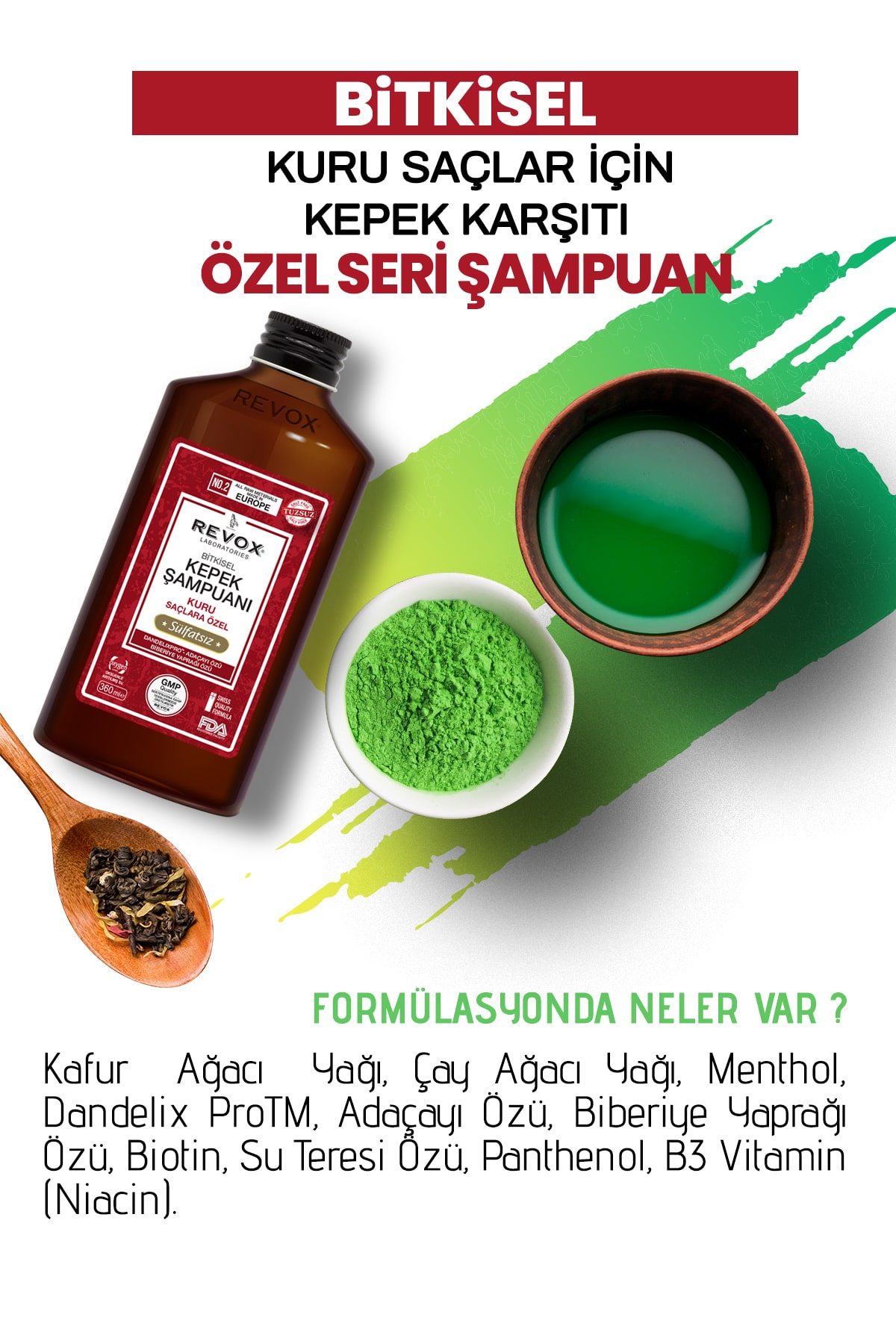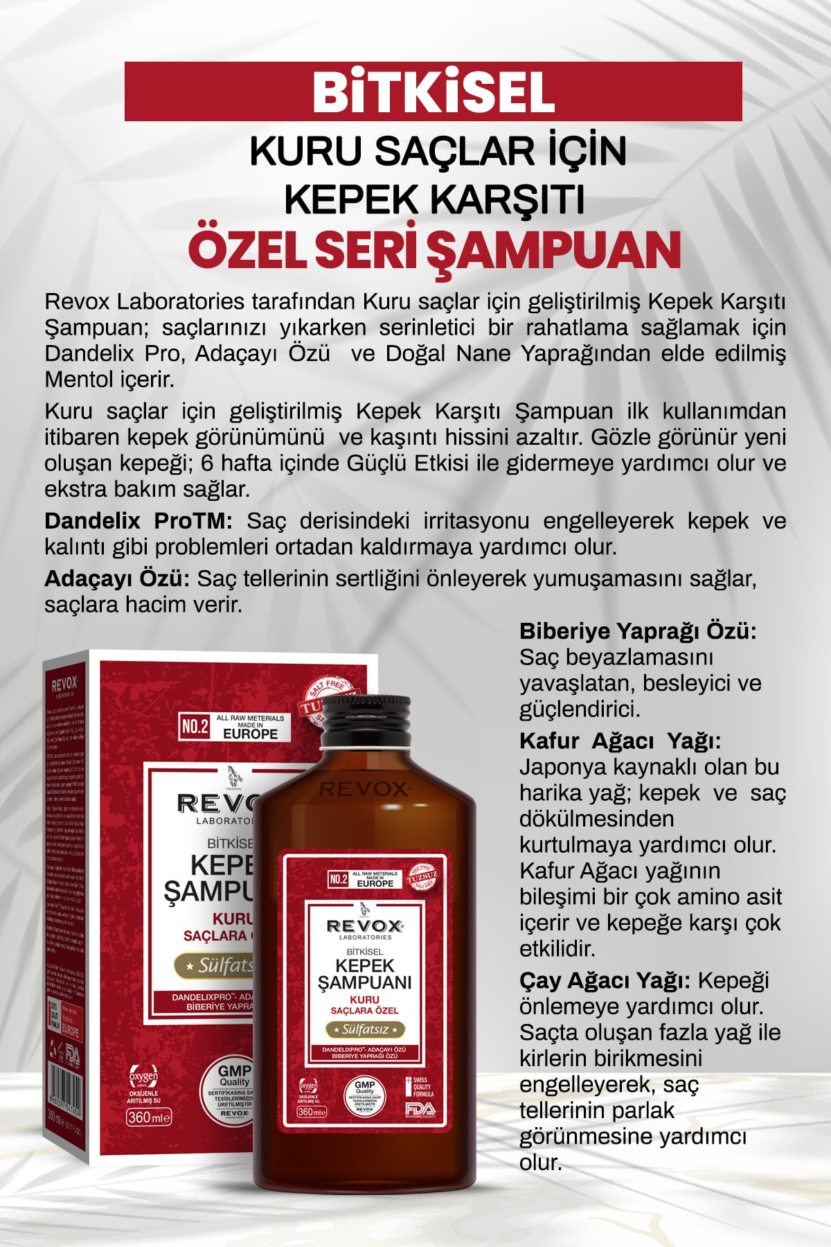 Revox Laboratories tarafından Türkiye'de ilk defa TUZSUZ ve SÜLFATSIZ olarak; Kuru saçlar için geliştirilmiş Bitkisel Kepek Karşıtı Şampuan; saçlarınızı yıkarken serinletici bir rahatlama sağlamak için Bitkisel Kafur Yağı, Çay Ağacı Yağı ve Doğal Nane Yaprağından elde edilmiş Mentol içerir.